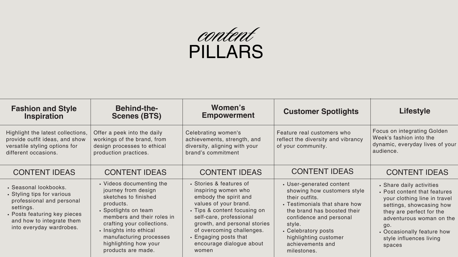 Alicia, the founder of Golden Week, sought to launch her first clothing collection with a striking online presence. She needed a cohesive strategy to define her brand, align her visuals, and establish a strong foundation for her Instagram debut.